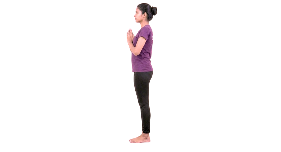 Stand at the edge of your mat facing the sun with folded hands in prayer position. Keep the legs together and stand straight. Breath normally.