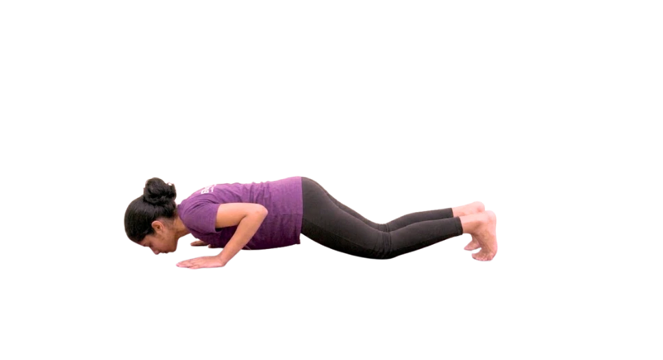Exhaling slowly lower the body on eight limbs of the body – two toes, two knees, chest, two hands and chin. The abdominal region is to be kept slightly above the mat.